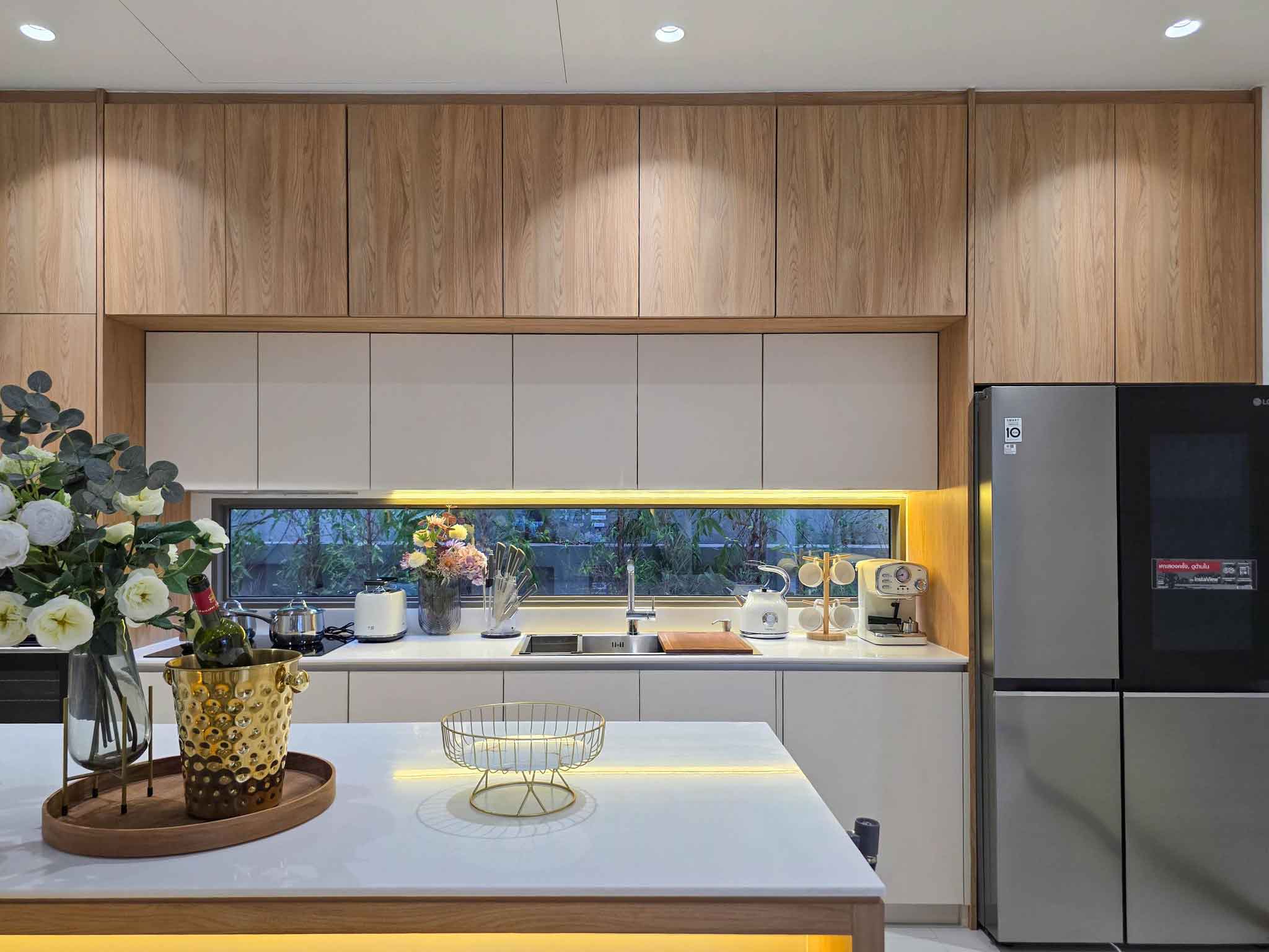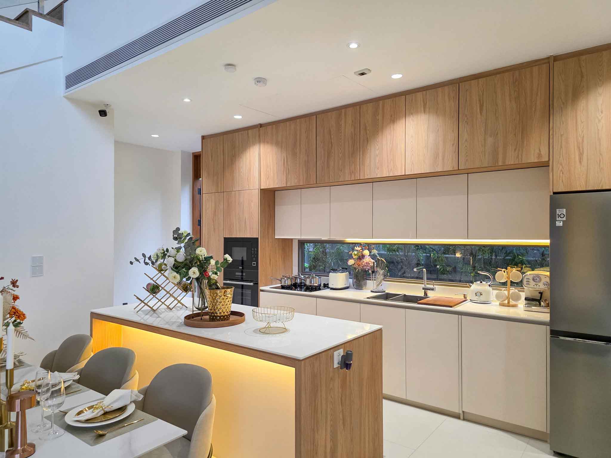 Sign end kitchen counter with a plethora of drawers and full equipments for your cooking needs.